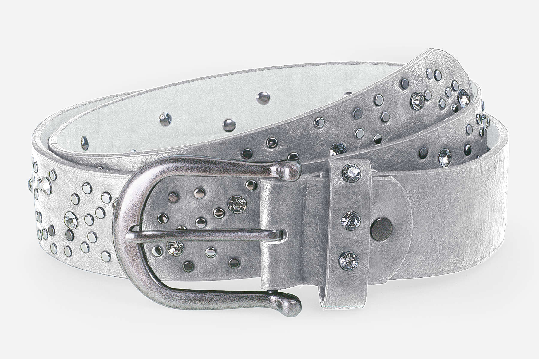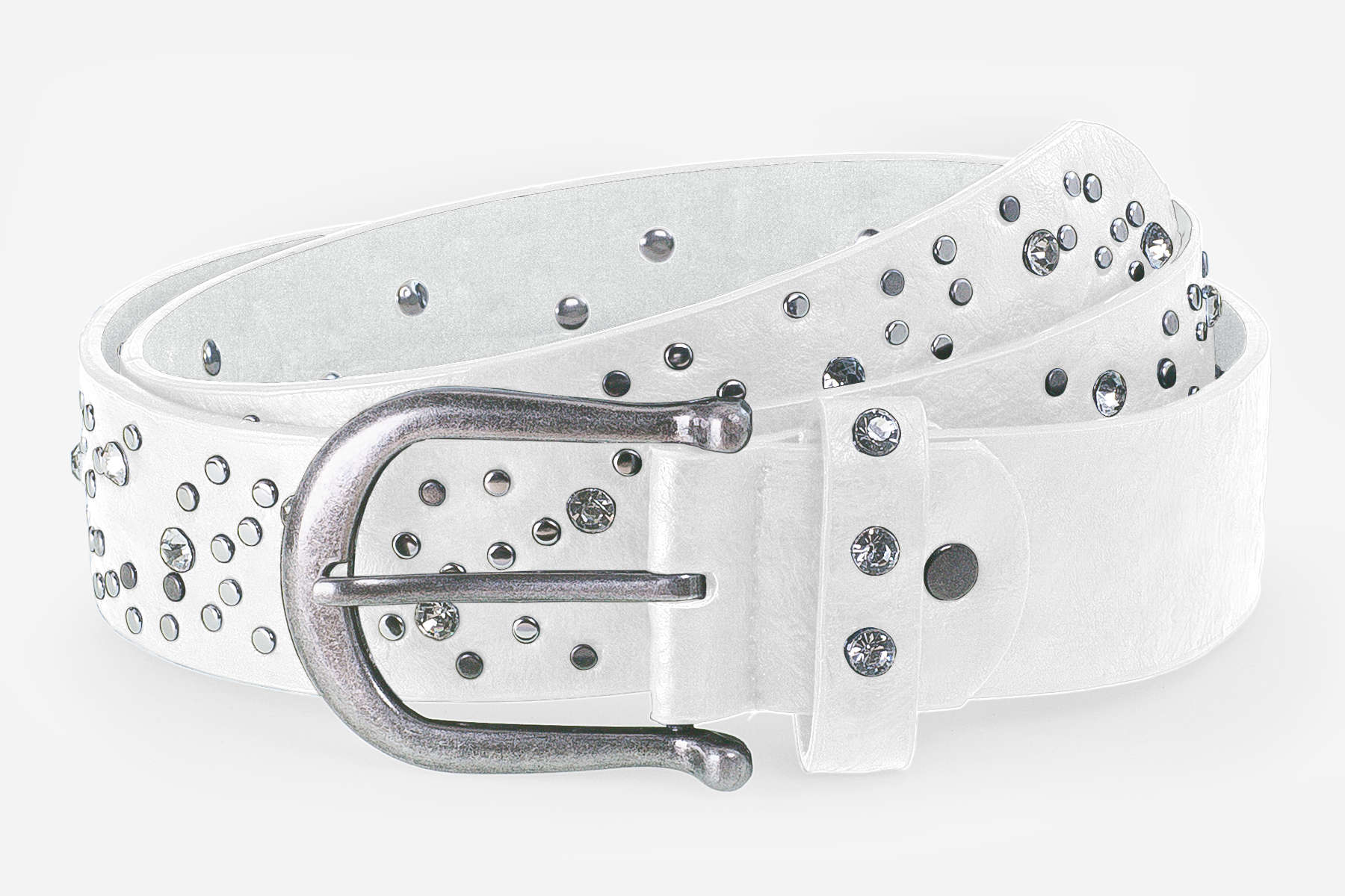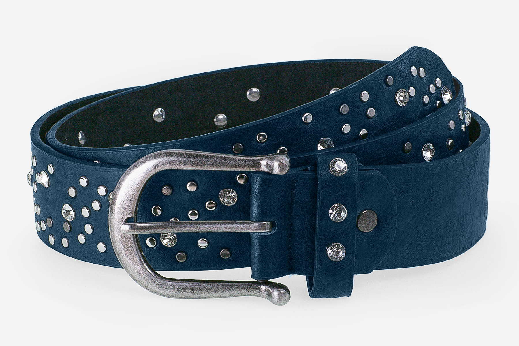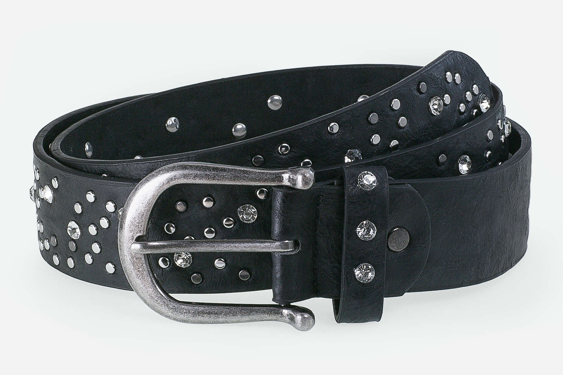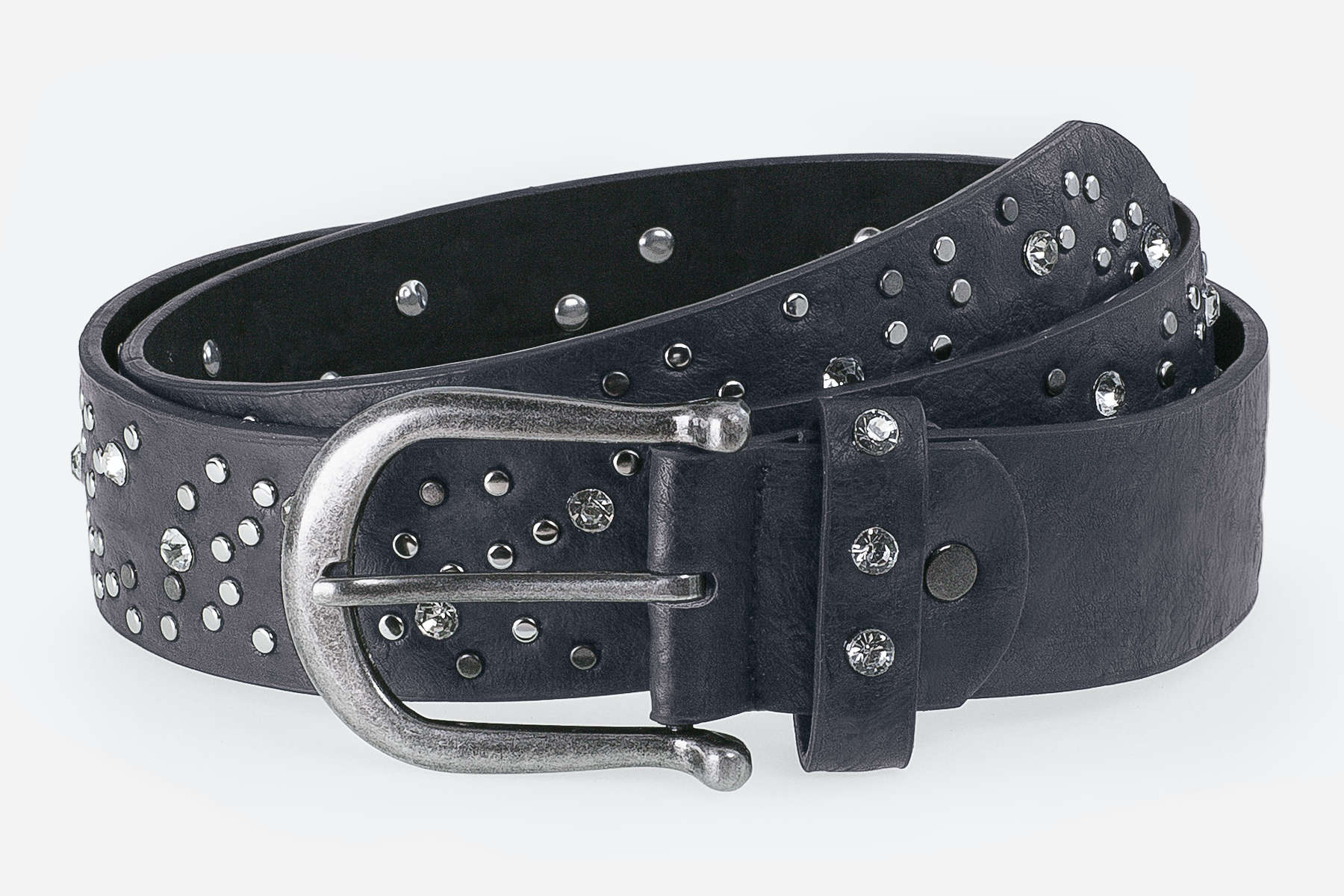 Dieser breite, modische Gürtel, verziert mit Nieten und größeren Strass-Steinen komplettiert jedes stylische Outfit.